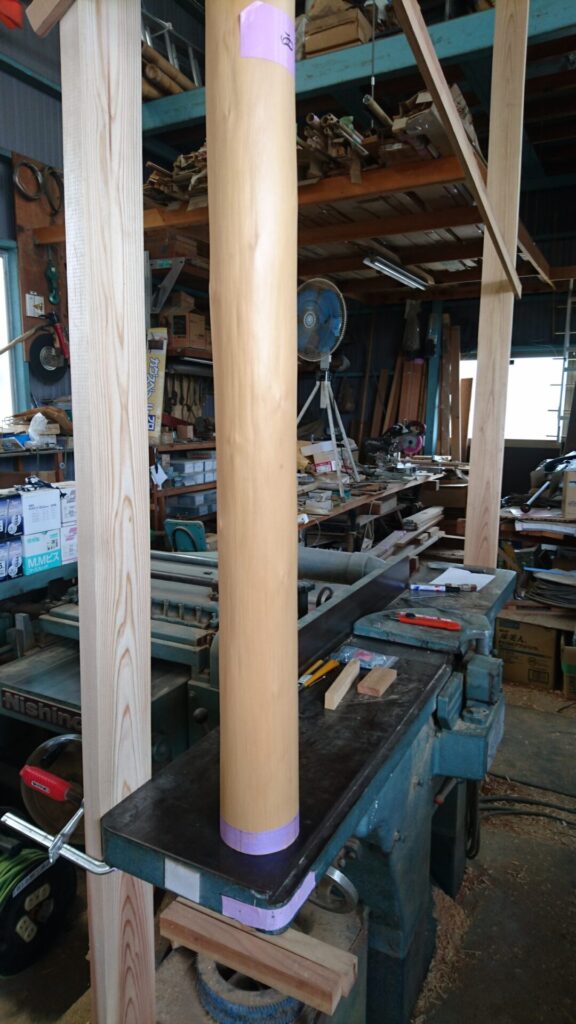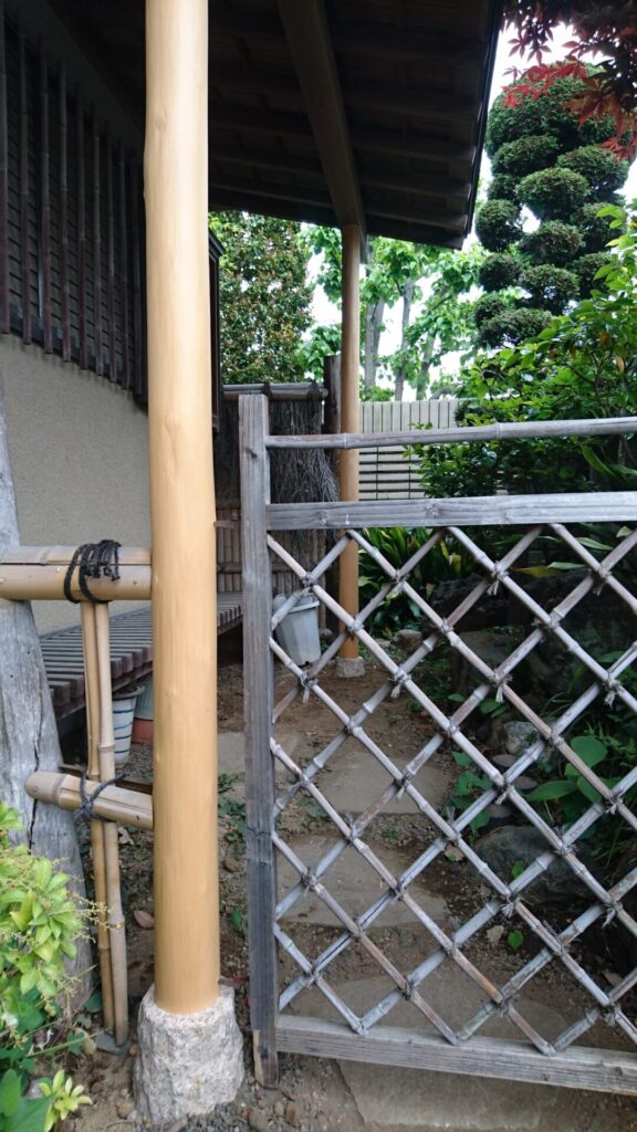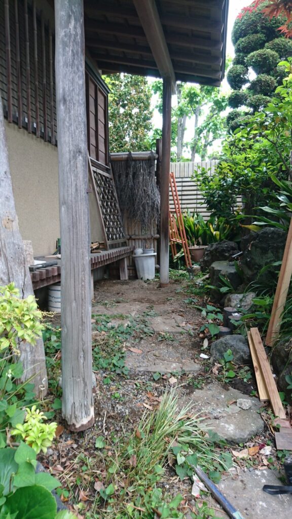 ◆和風ひさし改修工事(手前の柱が9cm腐って沈む)石をすえつけ柱の不朽を防ぐ