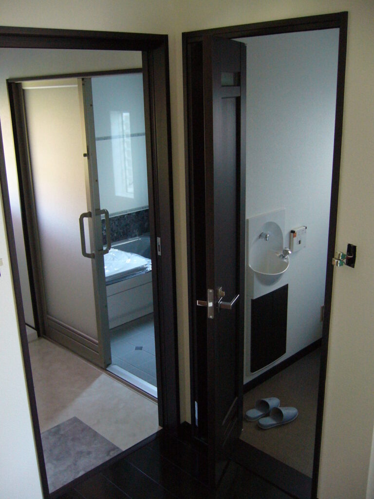洗面所、浴室、トイレへは吊り戸式片引戸や中折戸など、10年20年先を考えての建具になります。
