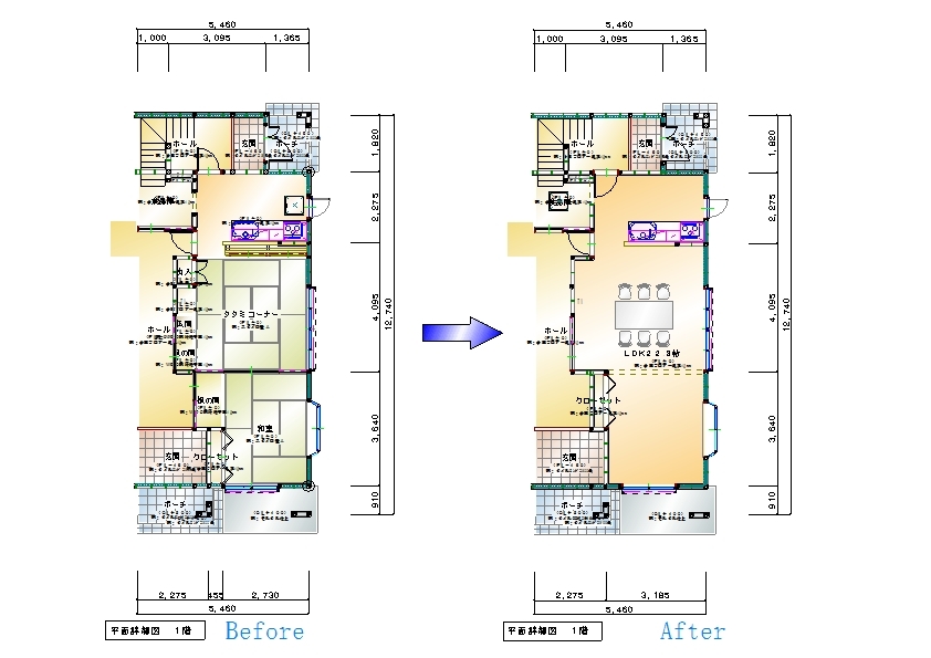 現在、和室7畳とダイニング9畳、キッチン5畳、収納スペース1.5畳があり、このスペースをワンフロアーにし、一番の希望である皆が集えるメインの大型ダイニングテーブルを置く(6人用)。