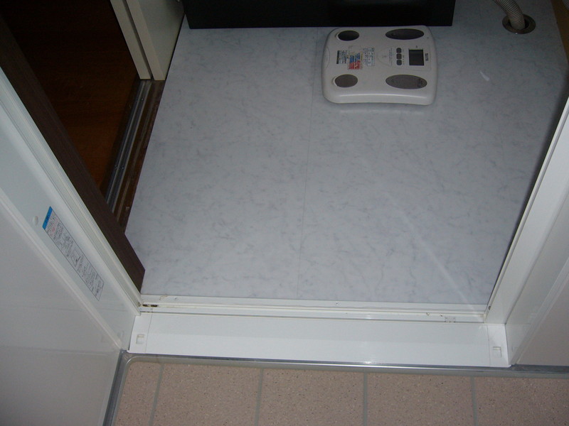 洗面所の壁・天井のカビや汚れ、何よりも浴室出入り口の床が危ない状態。