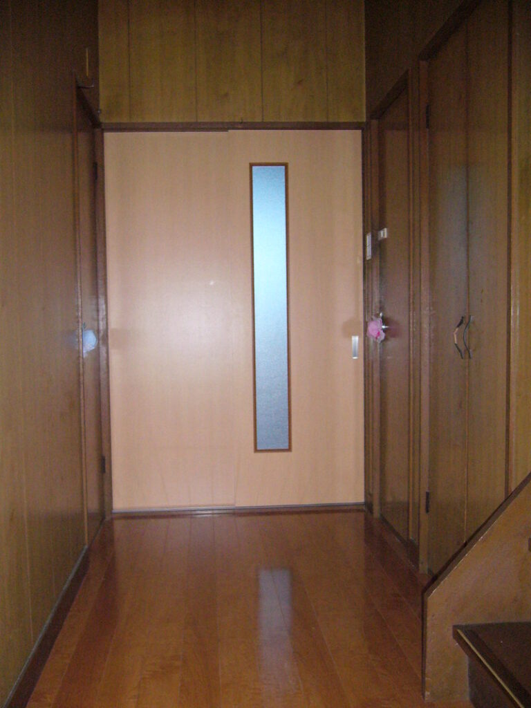 • 洗面所の片引戸に縦長の樹脂パネルを入れ今まで光の入らない中廊下もほんのり明るく、張り替えた床に跳ね返る