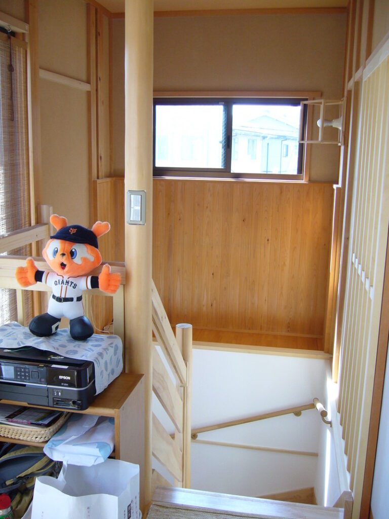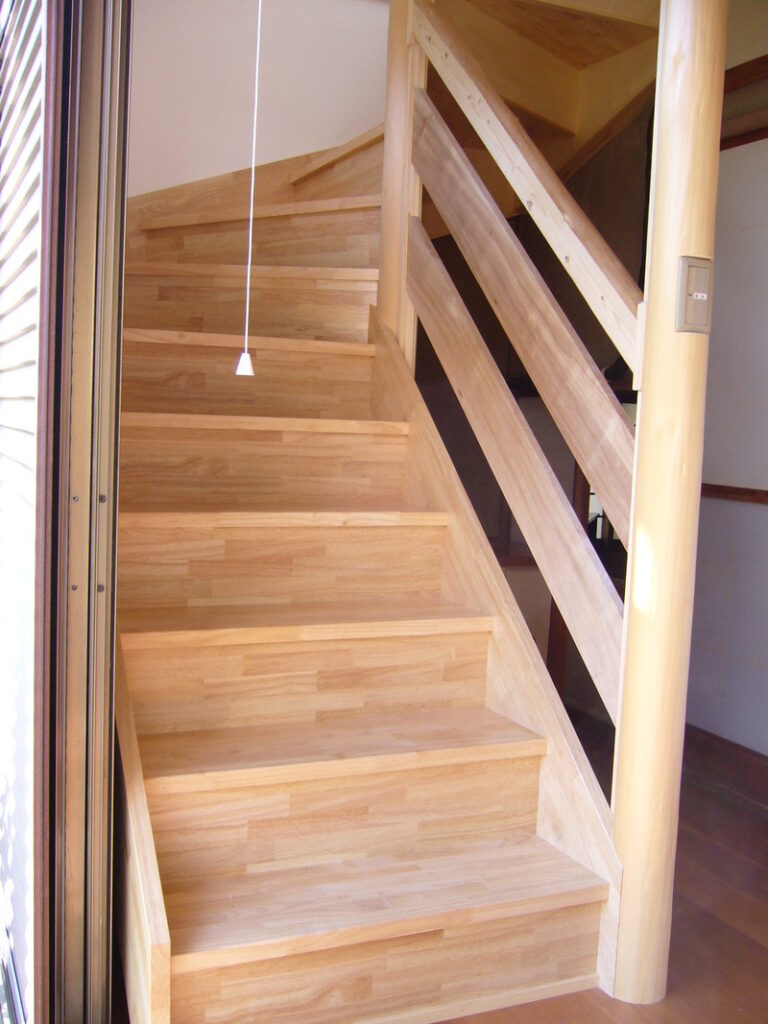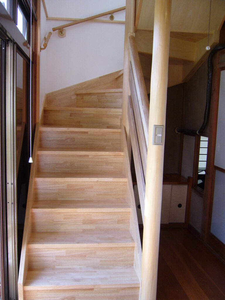 階段でつなぐ上下階が共に廊下で和風なので、丸太を使った階段は全体にマッチ