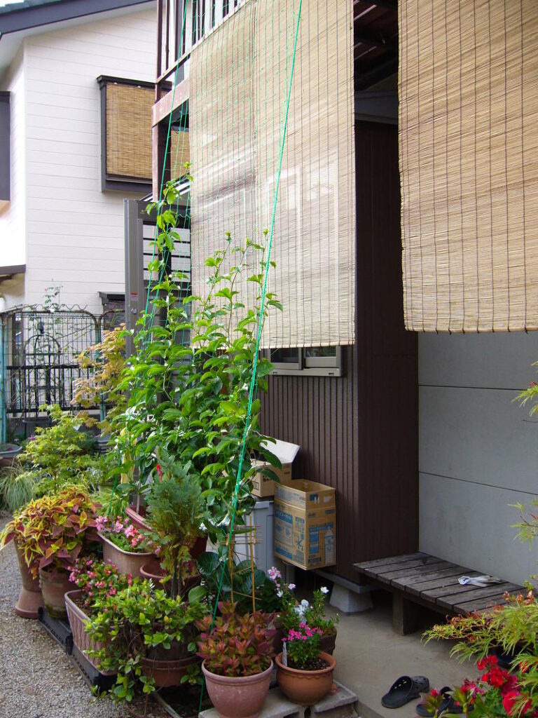完成後、早速すだれを垂らし緑のカーテン<パッションフルーツ>楽しみですね!
