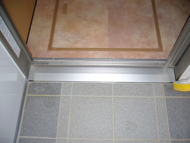 浴室出入り口の床のきしみ、木枠が腐った。給湯器の能力不足